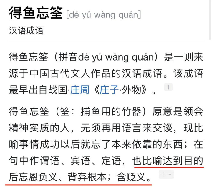 配文是个偏门的成语,“得鱼忘笙”,含强烈的贬义,配图就更直接,挑明了被人过河拆桥。